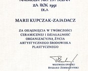 ..."rasowa rzeźbiarka". Pisząc to mam na myśli: arystokratyczna, inna od tych, którzy ją otaczają, nieprzeciętna, wyrazista, wybitna. Tworzy prace szorstkie, nieszkliwione, sprawiające wrażenie surowych i czerstwych, w naturalnych kolorach ziemi. Materiał, z którym pracuje, to porcelana i glina szamotowa...