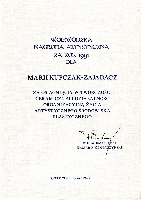 przemawiając do nas bogactwem subtelnych i zrównoważonych, innym razem dynamicznych i pełnych napięć obrazów natury. Kruche, ulotne niczym ptaki prace opolskiej artystki Marii Kupczak-Zajadacz, to niemal zaprzeczenie właściwości ceramicznej materii. Naprężone i delikatne, jak pająki obejmują przestrzeń. Wieloelementowa kompozycja inspirowana światem przyrody jest jednocześnie możliwością kontemplacji piękna w nim zawartego...